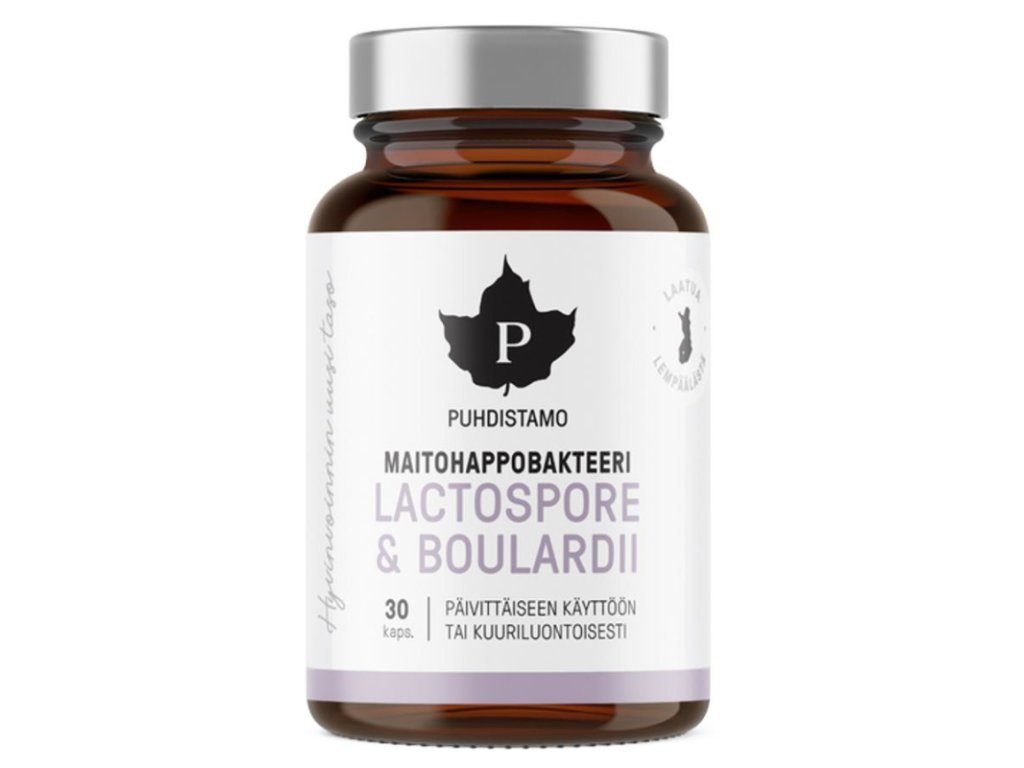 Puhdistamo Lactic Acid Bacteria + Boulardii je efektivní kombinací probiotických kultur (kvasinek) Saccharomyces boulardii značky Lactospore® a kultur Bacillus coagulans značky Lynside®.