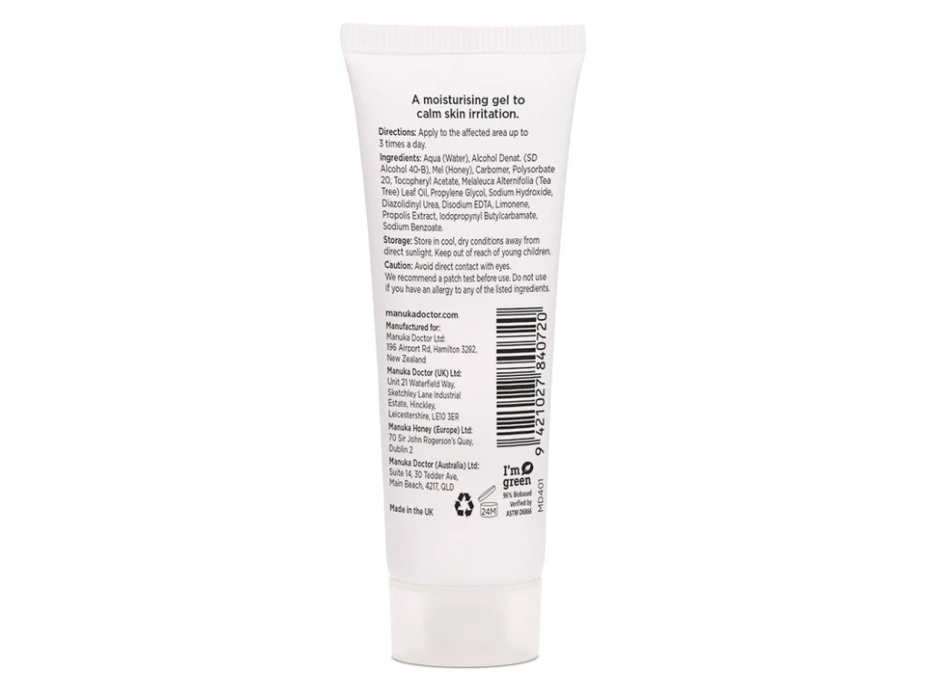 Chladivé složení zklidňuje podrážděnou pokožku, hydratuje a chrání. Tento rychle působící antiseptický gel napuštěný hydratačním manukovým medem z našich vlastních včelstev, propolisem bohatým na antioxidanty a antibakteriálním Tea Tree přináší osvěžující pocit při kontaktu s pokožkou a pomáhá zmírnit pocity nepohodlí, zmírnit záněty a zklidnit pokožku.
