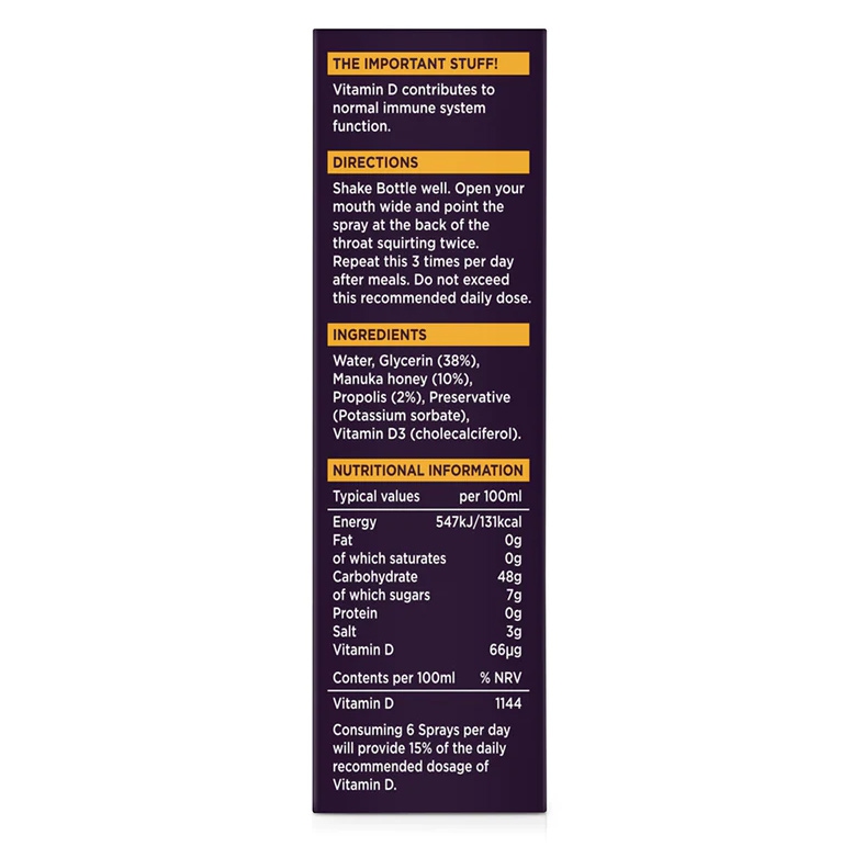 Užívání ústního spreje s propolisem a manuka medem má pozitivní vliv na imunitní systém navíc je obohacen o vitamín D3. Propolis má antibiotické, protiplísňové, antibakteriální, antivirové a protizánětlivé vlastnosti.