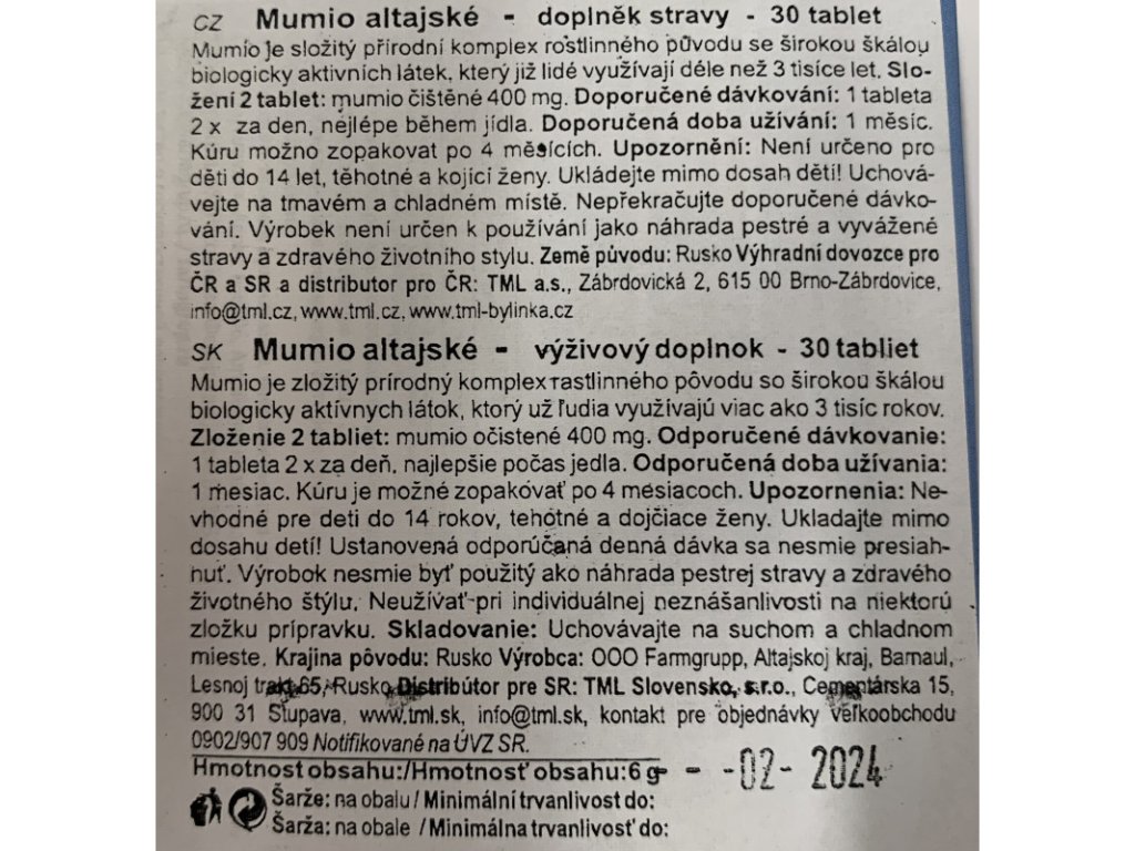 Mumio je zvláštní, pryskyřici podobná látka, která se vyskytuje v podobě krápníčků v jeskyních vysokých hor jako je Kavkaz, Altaj a Tian šan - odtud taky pochází jeho název Slzy hor. Mumio má temně hnědou až černou barvu a specifickou chuť. Je dobře rozpustné ve vodě i v lihu, teplem prstů měkne. Složení 1 tablety: 200 mg čistého mumia.