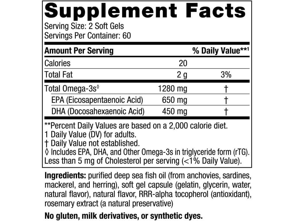 Čištěný hlubokomořský rybí olej (z ančoviček a sardinek), měkká gelová kapsle (želatina, glycerin, voda, přírodní citronové aroma), přírodní citronové aroma, d-alfa tokoferol (antioxidant), extrakt z rozmarýnu (přírodní konzervační látka).