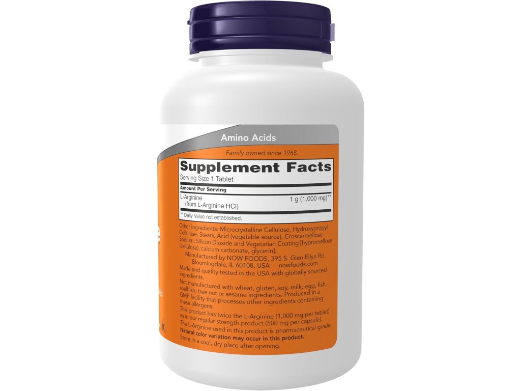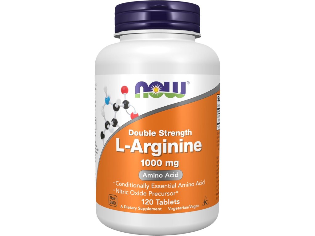 NOW Foods L-arginin 1 000 mg je doplněk stravy s podmíněně esenciální aminokyselinou, oblíbený pro podporu tvorby oxidu dusnatého (NO) a výkonu, v praktických tabletách s dvojnásobnou silou.