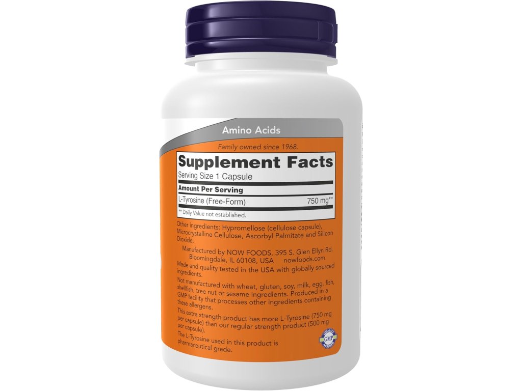 NOW Foods L-tyrosin 750 mg je extra silný doplněk stravy s aminokyselinou pro podporu tvorby neurotransmiterů (dopamin, adrenalin, noradrenalin), mentální bdělosti a normální funkce štítné žlázy.