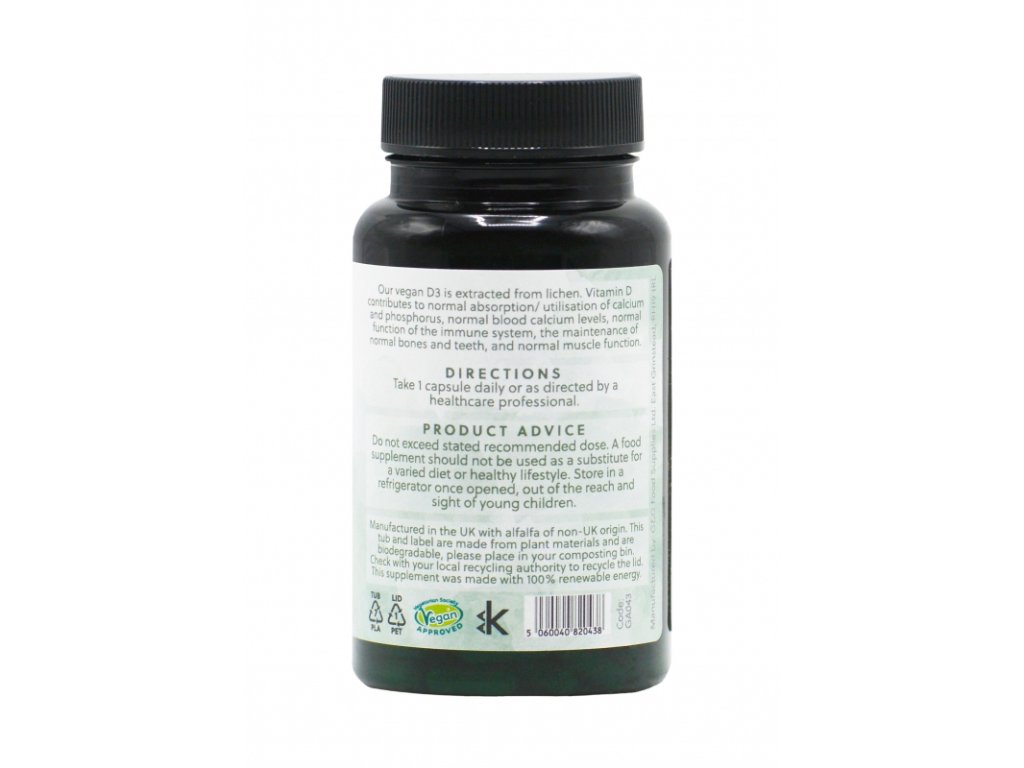 - Naturalna, wegańska forma witaminy D3 z porostów (alg) – suplement diety