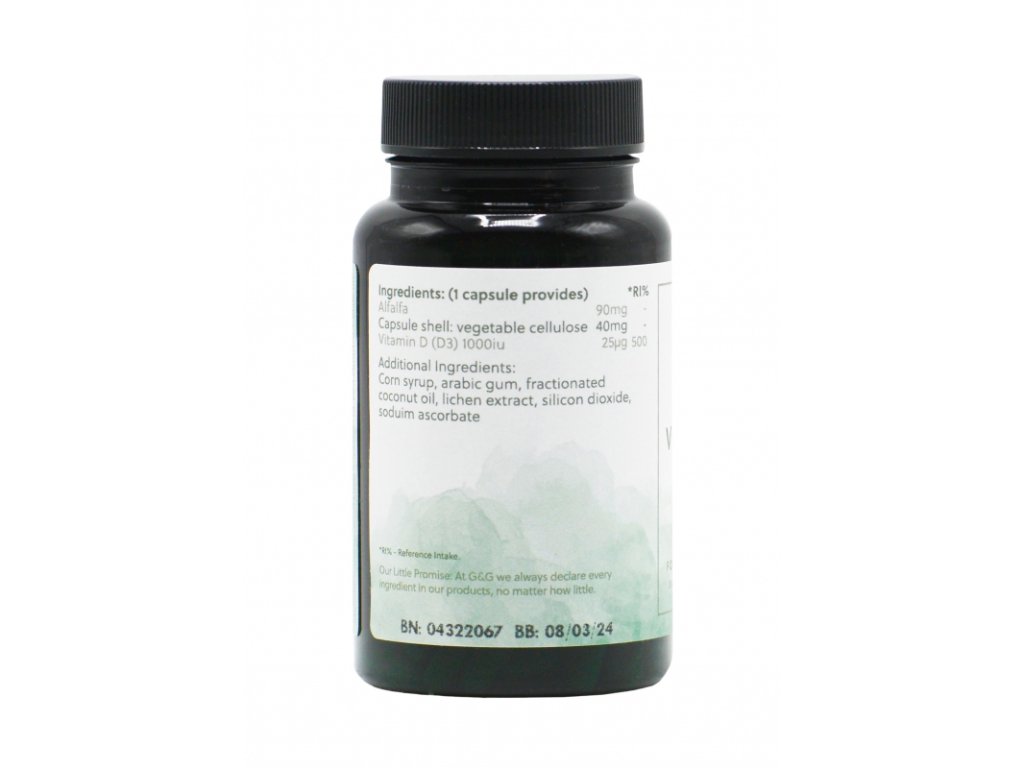 - Wzbogacony lucerną – dodatek lucerny do suplementu diety zwiększa działanie witaminy D i wspomaga jej wchłanianie. Lucerna jest bogata w wiele dobroczynnych substancji, takich jak witaminy, minerały, chlorofil i przeciwutleniacze, które mogą działać synergicznie z witaminą D.