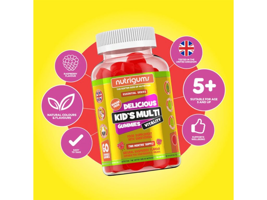 Naturalne, smaczne i zdrowe! Nutrigums® Kids Multi Vitality oferuje dzieciom pyszną, żującą galaretkę o naturalnym smaku malinowym. Zawiera 8 kluczowych witamin w bioaktywnych formach, które wspierają zdrowy wzrost, mocne kości, mocne zęby, odporność i prawidłowe funkcjonowanie mózgu.