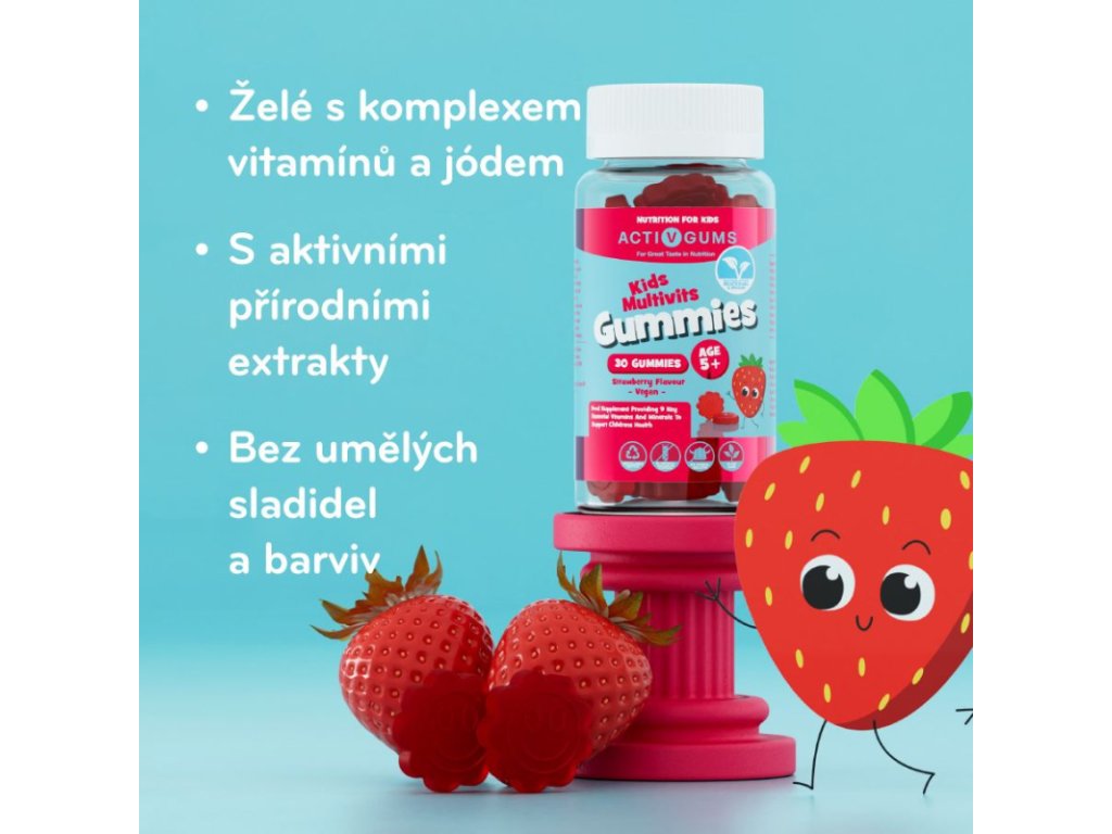 Żelki ActiVgums są:- Wegańskie i wegetariańskie- Bez żelatyny zwierzęcej- Bez sztucznych substancji słodzących i barwników- Zapakowane w butelkę w 100% nadającą się do recyklingu- NIE GMO- Bezglutenowe- Nie testowane na zwierzętach- Odpowiednie dla dzieci od 5. roku życiaOpakowanie:30 żelek (75 g) Dawkowanie:Dzieci od 5. roku życia: 1 żel dziennie. Żuć przed połknięciem. Ostrzeżenie:Nieodpowiednie dla dzieci poniżej 5. roku życia. Nie zastępuje zróżnicowanej diety. Nie przekraczać zalecanej dawki. Przechowywać w suchym, chłodnym i ciemnym miejscu, poza zasięgiem dzieci. W przypadku regularnego przyjmowania leków, ciąży lub karmienia piersią, przed zastosowaniem należy skonsultować się z lekarzem.| Składniki aktywne: | w 1 galaretce (2,5 g) (% RHP*) |
