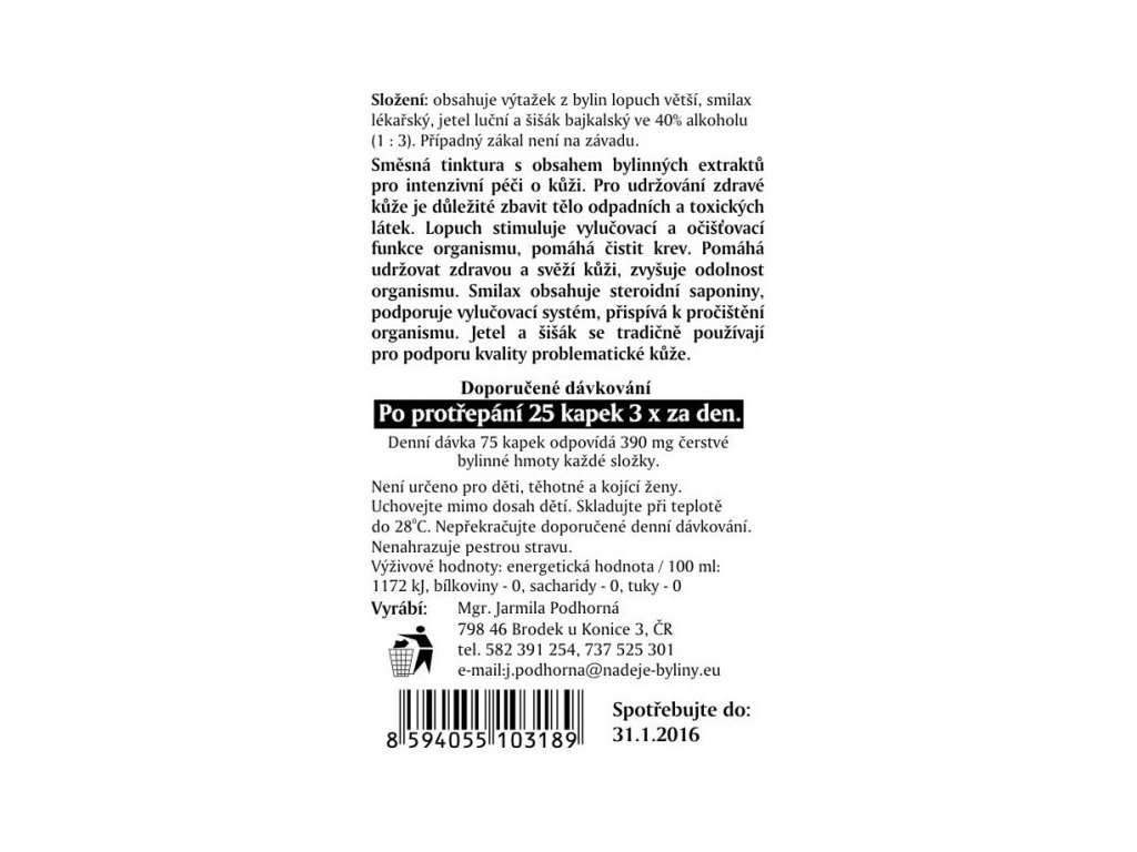 Literatura specjalistyczna podaje: mieszanka łopianu, smilaxu, koniczyny i jeżówki intensywnie dba o kondycję skóry. Dla utrzymania zdrowej skóry ważne jest usuwanie z organizmu toksyn i produktów przemiany materii. Ta mieszanka ziół oczyszcza przede wszystkim narządy wewnętrzne, zwłaszcza jelita, wątrobę i pęcherzyk żółciowy. Łopian oczyszcza również krew, działa odkażająco. Smilax zawiera saponiny steroidowe, wspomaga układ wydalniczy, przyczynia się do detoksykacji wątroby. Koniczyna wraz z jeżówką są przeznaczone przede wszystkim do poprawy jakości skóry.