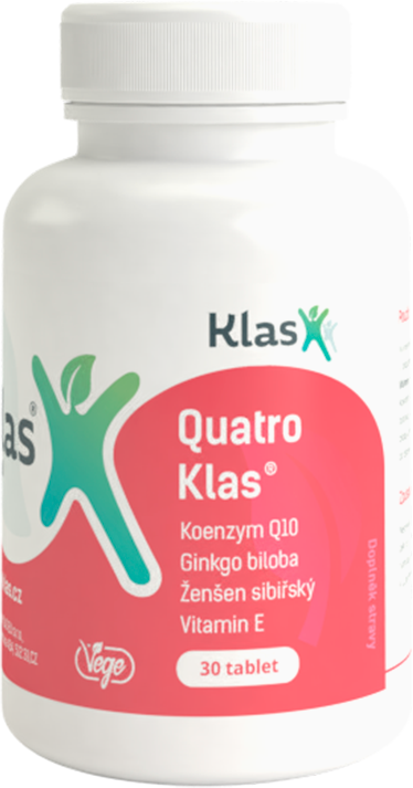 Jde o unikátní kombinaci čtyř věhlasných látek: koenzym Q 10, ginkgo biloba, sibiřský ženšen (eleutherococcus) a vitamin E. Quatro Klas má omlazující účinek, především brání předčasnému stárnutí, přináší sílu, koncentraci a výkon.