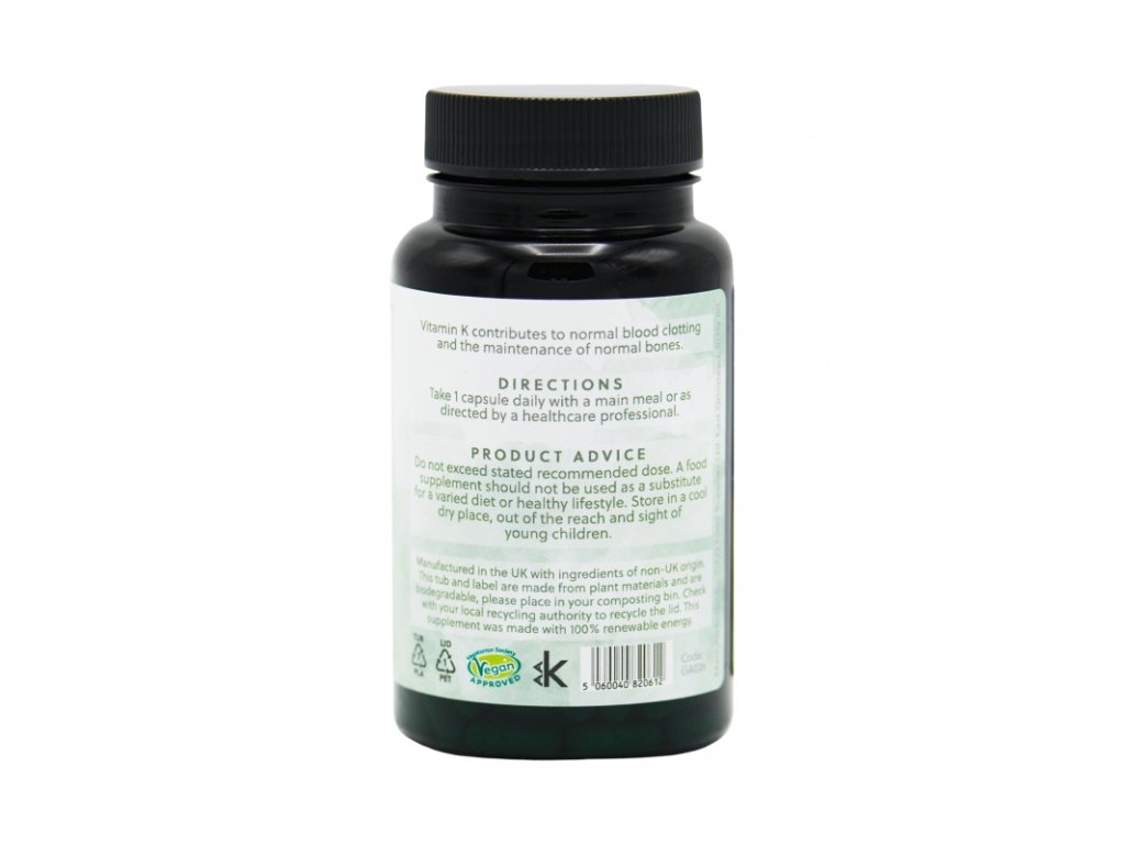 Vitamina K2 de înaltă concentrație oferă exact ceea ce v-ați aștepta, vitamina K de înaltă calitate și potență ridicată într-o capsulă de celuloză vegetală. Fiecare capsulă oferă 200 μg de vitamina K2 (MK-7).