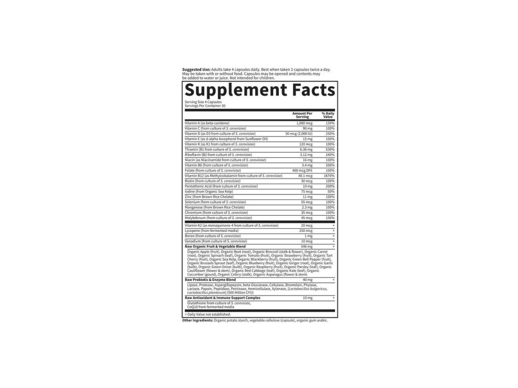 Ingrediente:Porție: 4 capsule Porții per recipient: 30 Cantitate per porție % Valoare zilnică Vitamina A (sub formă de beta-caroten) 1.080 mcg 120%. Vitamina C (din cultura S. cerevisiae) 90 mg 100% Vitamina D (sub formă de D3 din cultura S. cerevisiae) 50 mcg (2.000 UI) 250% Vitamina E (sub formă de d-alfa tocoferol din ulei de floarea-soarelui) 15 mg 100% Vitamina K (sub formă de K1 din cultura S. cerevisiae) 120 mcg 100% Tiamină (B1 din cultura S. cerevisiae) 6,36 mg 530% Riboflavină (B2 din cultura S. cerevisiae) 3,12 mg 240% Niacină (sub formă de niacinamidă din cultura S. cerevisiae) 16 mg 100% Vitamina B6 (din cultura S. cerevisiae) 3,4 mg 200% Folat (din cultura S. cerevisiae) 400 mcg DFE 100% Vitamina B12 (sub formă de metilcobalamină din Cultură de S. cerevisiae) 40,1 mcg 1670% Biotină (din cultura de S. cerevisiae) 30 mcg 100% Acid pantotenic (din cultura de S. cerevisiae) 10 mg 200% Iod (din alge marine organice) 75 mcg 50% Zinc (din chelat de orez brun) 11 mg 100% Seleniu (din cultura de S. cerevisiae) 55 mcg 100% Mangan (din chelat de orez brun) 2,3 mg 100% Crom (din cultura de S. cerevisiae) 35 mcg 100% Molibden (din cultura de S. cerevisiae) 45 mcg 100% Vitamina K2 (sub formă de menachinonă-4 din cultura de S. cerevisiae) 20 mcg + Licopen (din medii fermentate) 250 mcg + Bor (din S. cultură S. cerevisiae) 1 mg + Vanadiu (din cultura S. cerevisiae) 10 mcg + Amestec crud de fructe și legume organice: Măr organic (fruct), Sfeclă roșie organică (rădăcină), Broccoli organic (tulpină și floare), Morcov organic (rădăcină), spanac organic (frunză), roșii organice (fruct), căpșuni organice (fruct), cireșe organice (fruct), alge marine organice, mure organice (fruct), ardei verde organic (fruct), varză de Bruxelles organică (frunză), afine organice (fruct), ghimbir organic (rădăcină), usturoi organic (bulb), ceapă verde organică (bulb), zmeură organică (fruct), pătrunjel organic (frunză), conopidă organică (floare și tulpină), varză roșie organică (frunză), kale organică (frunză), castravete organic (dovlecei), țelină organică (tulpină), sparanghel organic (floare și tulpină). 546 mg + Amestec crud de probiotice și enzime Lipază, protează, aspergilopepsină, beta-glucanază, celulază, bromelaină, fitază, lactază, papaină, peptidază, pectinază, hemicelulază, xilanază, [Lactobacillus bulgaricus, Lactobacillus plantarum] (500 de milioane UFC) 40 mg + Complex antioxidant și de susținere a imunității Glutation din cultura S. cerevisiae, CoQ10 din medii fermentate 10 mg + + Valoare zilnică nestabilită. Alte ingrediente Amidon de cartofi organic, celuloză vegetală (capsulă), gumă arabică organică. Fabricat fără lactate, soia, arahide, nuci și crustacee. Fabricat într-o unitate care procesează și soia, lactate, arahide, nuci și crustacee. Fără coloranți sau conservanți artificiali.