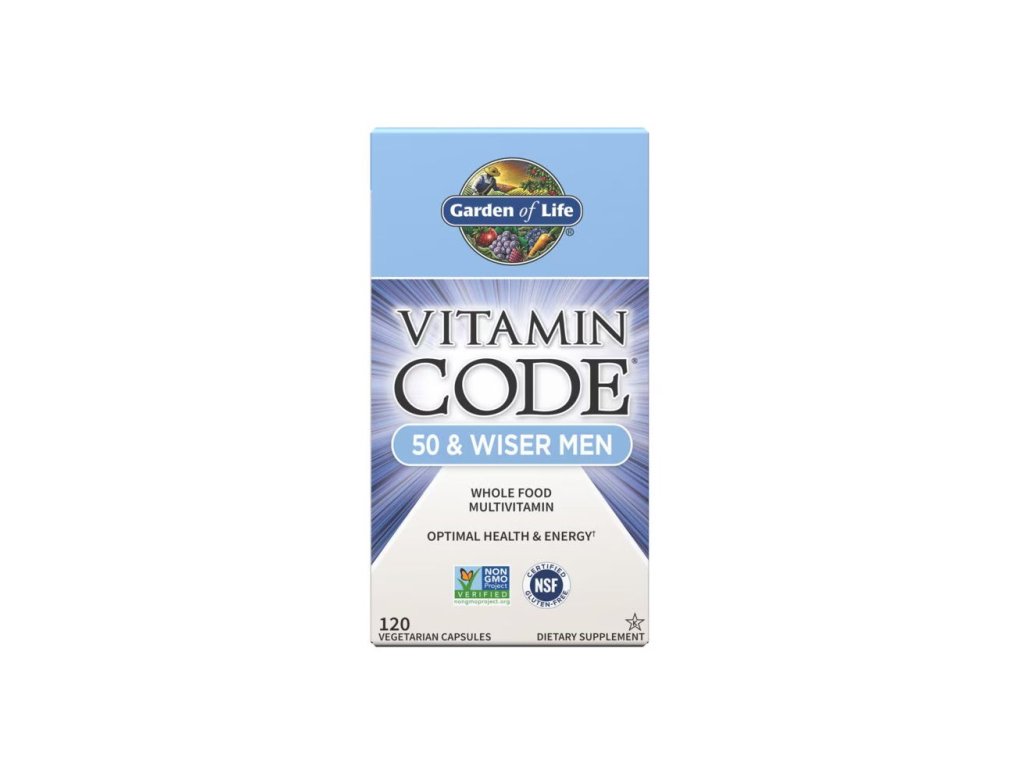 Garden of Life Vitamin Code 50 & Wiser Men este un supliment alimentar RAW complet pentru bărbații de peste 50 de ani. Conține vitamine, minerale, antioxidanți, probiotice și enzime din fructe și legume cultivate organic pentru a susține sănătatea inimii, prostatei, memoriei și digestiei.