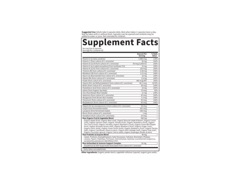 Ingrediente:Porție: 4 capsule Porții per recipient: 30 Cantitate per porție % Valoare zilnică Vitamina A (sub formă de beta-caroten) 1.080 mcg 120%. Vitamina C (din cultura S. cerevisiae) 90 mg 100% Vitamina D (sub formă de D3 din cultura S. cerevisiae) 50 mcg (2.000 UI) 250% Vitamina E (sub formă de d-alfa tocoferol din ulei de floarea-soarelui) 15 mg 100% Vitamina K (sub formă de K1 din cultura S. cerevisiae) 120 mcg 100% Tiamină (B1 din cultura S. cerevisiae) 6,36 mg 530% Riboflavină (B2 din cultura S. cerevisiae) 3,12 mg 240% Niacină (sub formă de niacinamidă din cultura S. cerevisiae) 16 mg 100% Vitamina B6 (din cultura S. cerevisiae) 3,4 mg 200% Folat (din cultura S. cerevisiae) 400 mcg DFE 100% Vitamina B12 (sub formă de metilcobalamină din Cultură de S. cerevisiae) 40,1 mcg 1670% Biotină (din cultura de S. cerevisiae) 30 mcg 100% Acid pantotenic (din cultura de S. cerevisiae) 10 mg 200% Iod (din alge marine organice) 75 mcg 50% Zinc (din chelat de orez brun) 11 mg 100% Seleniu (din cultura de S. cerevisiae) 55 mcg 100% Mangan (din chelat de orez brun) 2,3 mg 100% Crom (din cultura de S. cerevisiae) 35 mcg 100% Molibden (din cultura de S. cerevisiae) 45 mcg 100% Vitamina K2 (sub formă de menachinonă-4 din cultura de S. cerevisiae) 20 mcg + Licopen (din medii fermentate) 250 mcg + Bor (din S. cultură S. cerevisiae) 1 mg + Vanadiu (din cultura S. cerevisiae) 10 mcg + Amestec crud de fructe și legume organice: Măr organic (fruct), Sfeclă roșie organică (rădăcină), Broccoli organic (tulpină și floare), Morcov organic (rădăcină), spanac organic (frunză), roșii organice (fruct), căpșuni organice (fruct), cireșe organice (fruct), alge marine organice, mure organice (fruct), ardei verde organic (fruct), varză de Bruxelles organică (frunză), afine organice (fruct), ghimbir organic (rădăcină), usturoi organic (bulb), ceapă verde organică (bulb), zmeură organică (fruct), pătrunjel organic (frunză), conopidă organică (floare și tulpină), varză roșie organică (frunză), kale organică (frunză), castravete organic (dovlecei), țelină organică (tulpină), sparanghel organic (floare și tulpină). 546 mg + Amestec crud de probiotice și enzime Lipază, protează, aspergilopepsină, beta-glucanază, celulază, bromelaină, fitază, lactază, papaină, peptidază, pectinază, hemicelulază, xilanază, [Lactobacillus bulgaricus, Lactobacillus plantarum] (500 de milioane UFC) 40 mg + Complex antioxidant și de susținere a imunității Glutation din cultura S. cerevisiae, CoQ10 din medii fermentate 10 mg + + Valoare zilnică nestabilită. Alte ingrediente Amidon de cartofi organic, celuloză vegetală (capsulă), gumă arabică organică. Fabricat fără lactate, soia, arahide, nuci și crustacee. Fabricat într-o unitate care procesează și soia, lactate, arahide, nuci și crustacee. Fără coloranți sau conservanți artificiali.