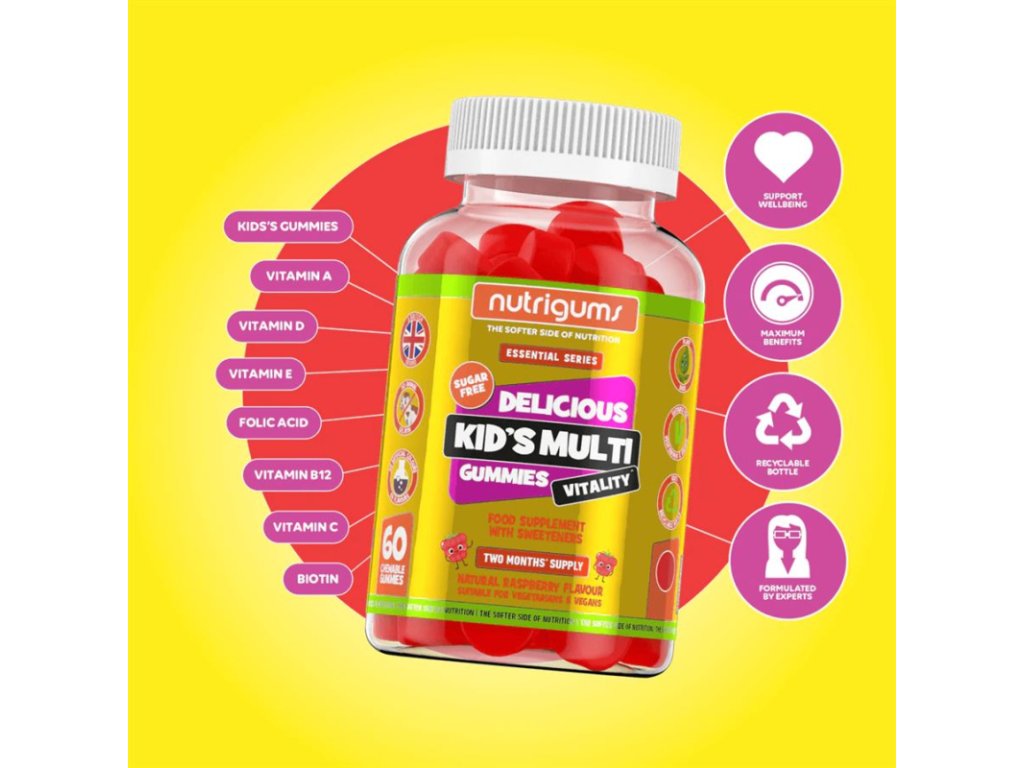 Natural, gustos și sănătos! Nutrigums® Kids Multi Vitality oferă copiilor un jeleu masticabil delicios cu aromă naturală de zmeură. Conține 8 vitamine cheie în forme bioactive care susțin o creștere sănătoasă, oase puternice, dinți puternici, imunitate și funcționarea corectă a creierului