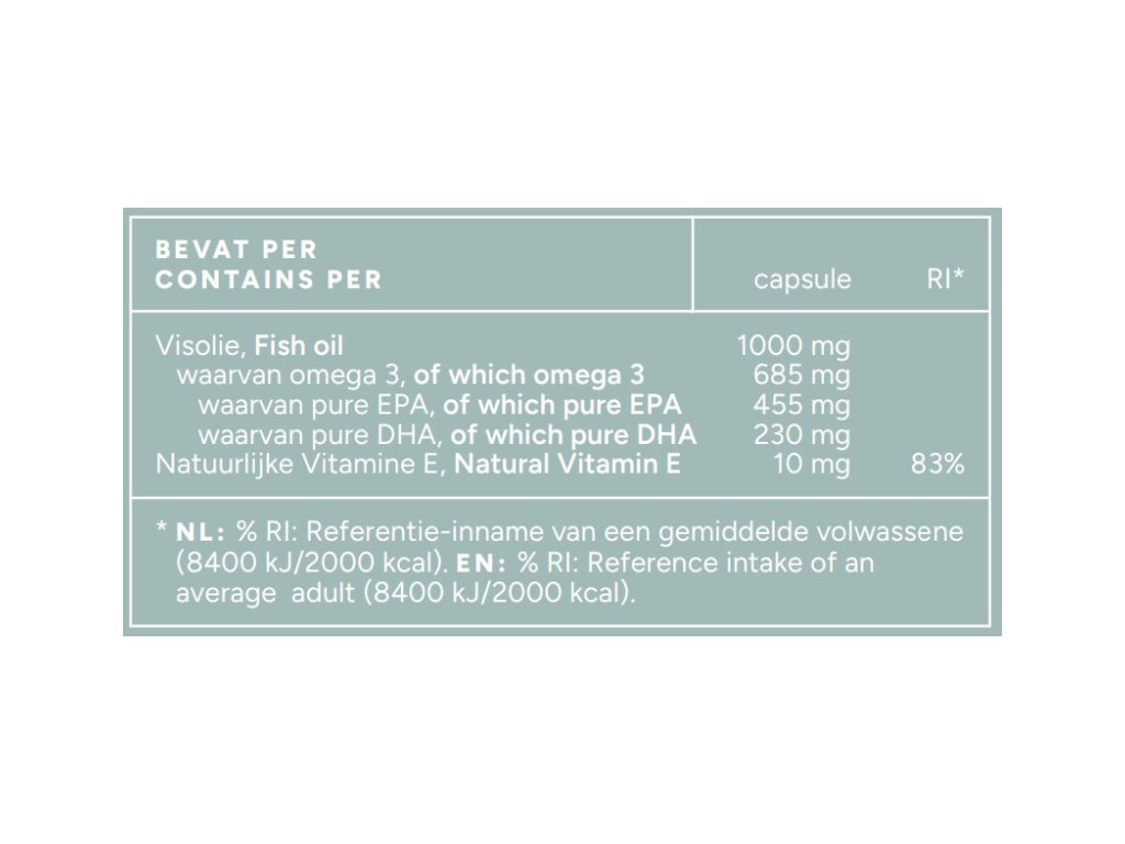 Uleiul de pește Omega 3 1000 mg conține ulei de pește pur de înaltă calitate și conține 500 mg EPA și 250 mg DHA (750 mg Omega 3 în total) într-o singură capsulă. În plus, s-a adăugat vitamina E suplimentară pentru a proteja produsul de oxidare. Valoarea TOTOX (Valoare Totală de Oxidare) este 7, ceea ce este un număr relativ mic și indică faptul că uleiul de pește din aceste capsule are un nivel scăzut de oxidare, este stabil și de înaltă calitate.