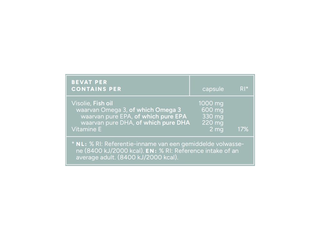 Uleiul de pește Omega 3 1000 mg conține ulei de pește pur, de înaltă calitate, și conține 350 mg EPA și 250 mg DHA (în total 600 mg Omega 3) într-o singură capsulă. În plus, s-a adăugat vitamina E suplimentară pentru a proteja produsul de oxidare. În același timp, aceasta reprezintă 63% din doza zilnică recomandată a acestei vitamine.