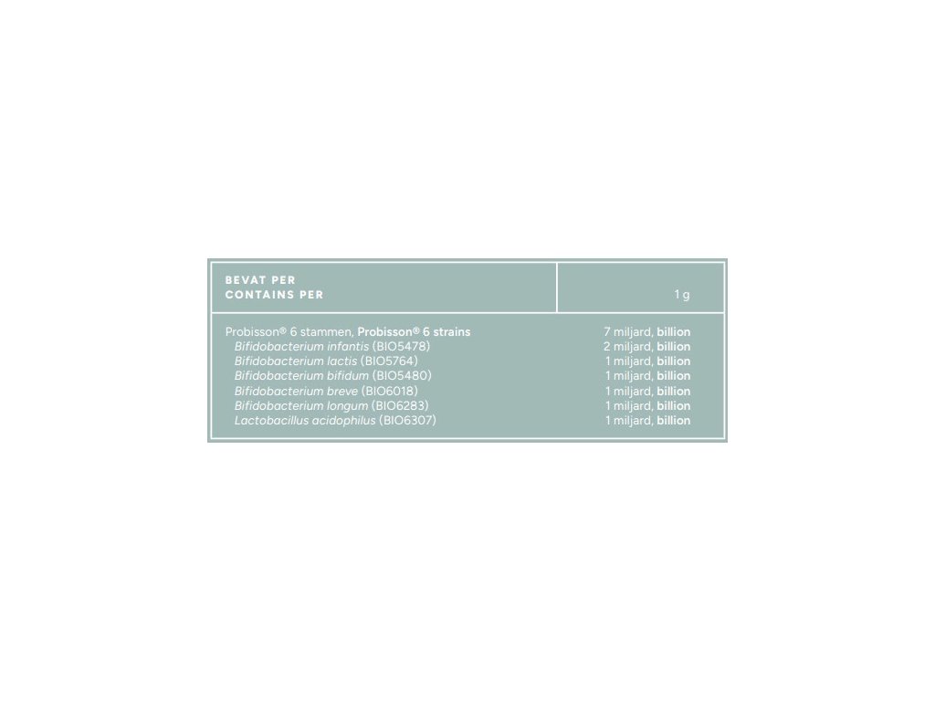 Această pulbere probiotică liofilizată este formată din 6 tulpini diferite și conține 7 miliarde UFC* pe gram. *UFC: unități formatoare de colonii.