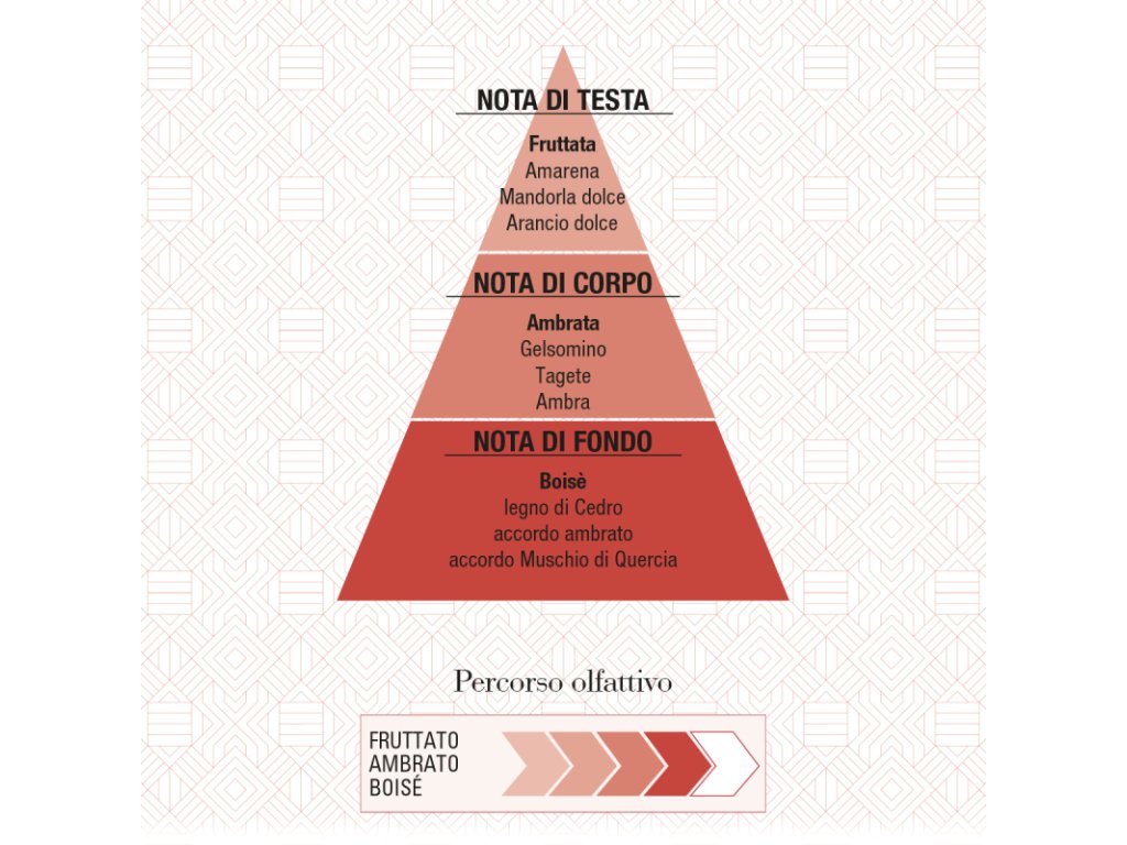 Rosso d’Ambra este un parfum senzual și atemporal care combină note fructate de cireșe Amarena și portocală dulce cu chihlimbar cald și aura lemnoasă elegantă a cedrului și stejarului.