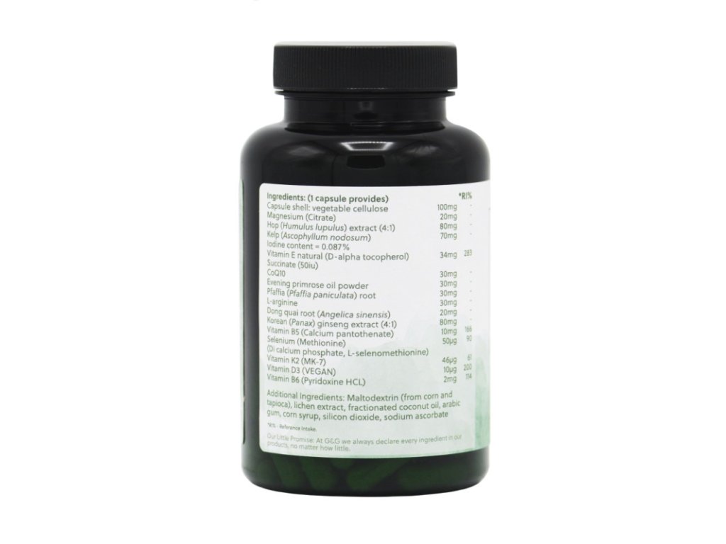 - Obsahuje pupalkový olej, dong quai, koenzým Q10, morské riasy, ženšen, vitamín B6, aloe vera a ďalšie.