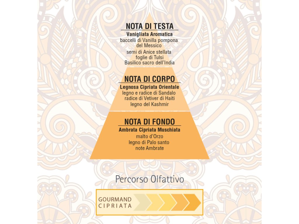 Vôňa začína svoju púť intenzívnymi tónmi vanilkového pompomu, ktoré sa miešajú s jemne korenistým badiánom a sviežimi zelenými tónmi svätej bazalky. Srdce vône sa otvára teplým drevitým objatím santalového dreva, kašmíru a haitského vetiveru.