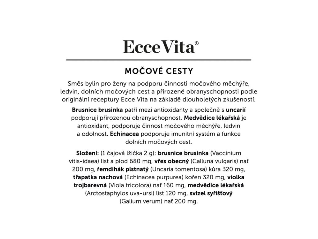 Izvirna mešanica 7 zelišč Ecce Vita® za podporo spodnjih sečil in imunskemu sistemu. Ta mešanica vsebuje brusnico, resje, medvedko, ehinacejo in druga zelišča.