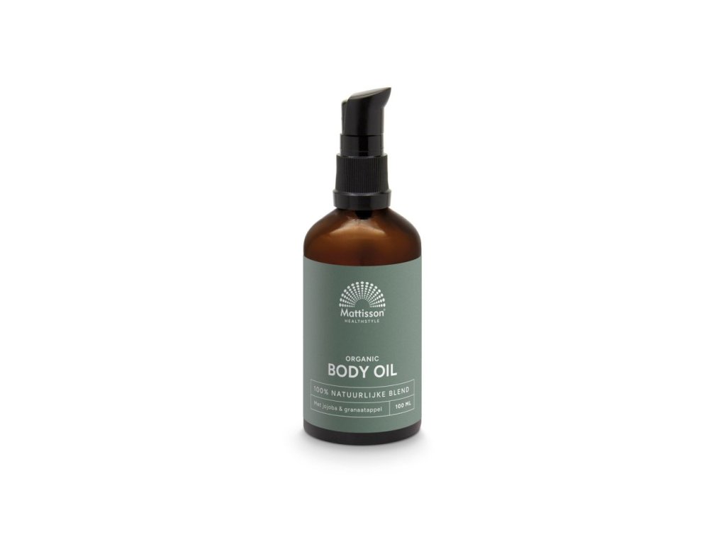 Mattisson BIO olje za telo – 100 ml. Negujoča mešanica organskih olj (jojoba, marelica, šipek, granatno jabolko, sončnica) za masažo, hidratacijo, regeneracijo in zaščito kože. Primerno za kožo, telo, lase in nohte.