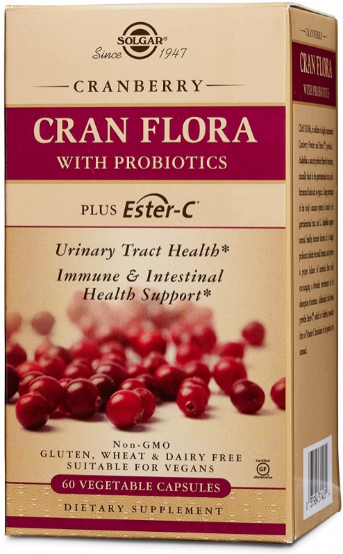 Doplněk stravy CRAN FLORA rostlinné kapsle od firmy Solgar poskytuje komplexní směs vysoce koncentrovaného brusinkového prášku, L. acidophilus a Ester – C pomáhající chránit zdraví močových cest a střev a podporující zdraví imunitní systém. Datum minimální spotřeby 12/22