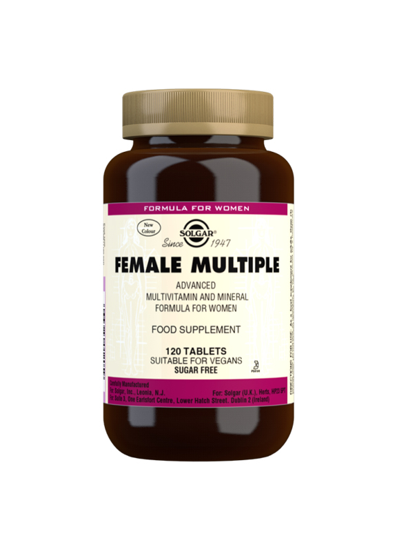 Solgar Female multiple. Multivitamín pro ženy s 27 klíčovými živinami pro optimální zdraví. Pro podporu žen s hektickým životem. Doplněk stravy.