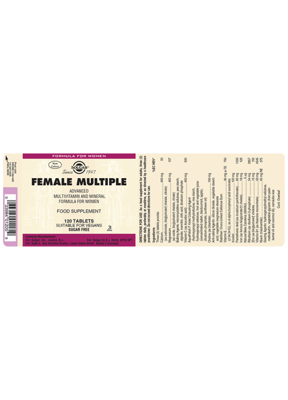 Solgar Female multiple. Multivitamín pro ženy s 27 klíčovými živinami pro optimální zdraví. Pro podporu žen s hektickým životem. Doplněk stravy....