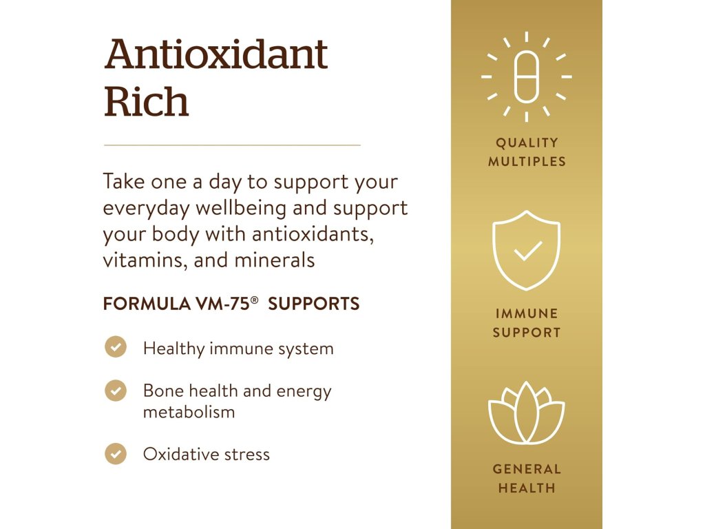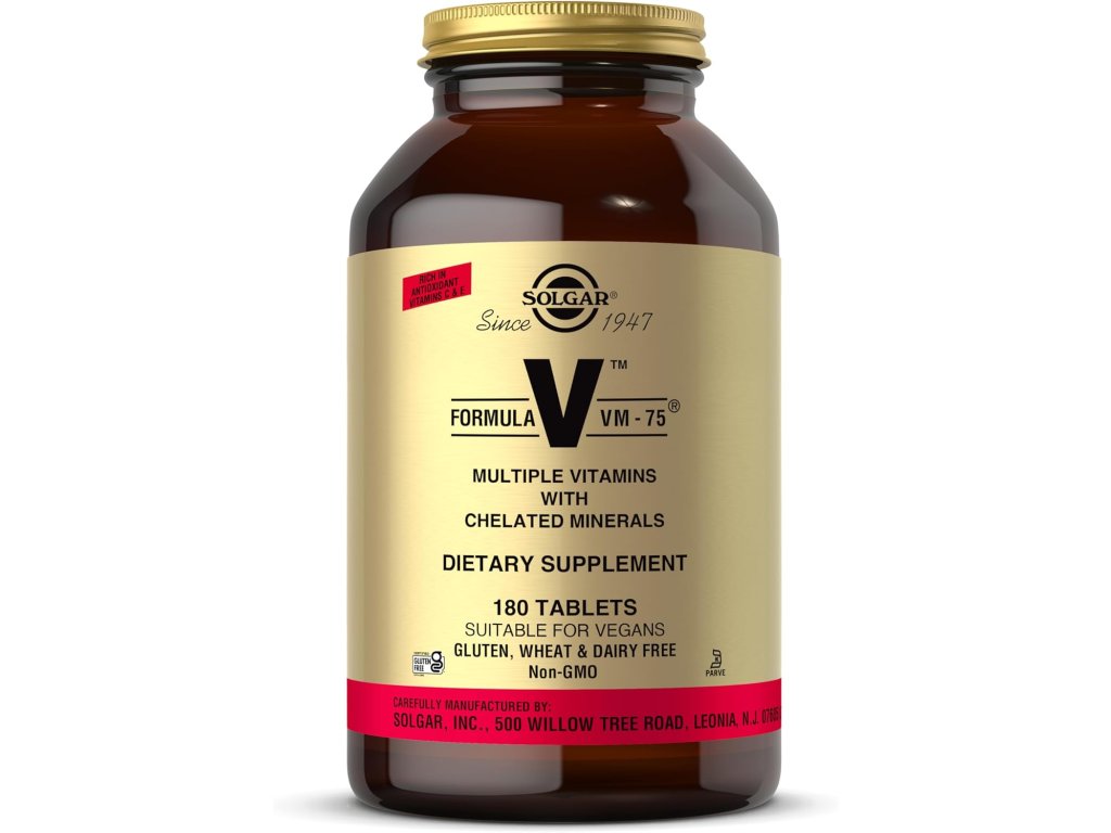 Formule VM-75 od firmy Solgar je číslo jedna mezi multivitamíny v průmyslu s přírodními produkty. "75" znamená, že VM 75 obsahuje 75 mg většiny vitamínů skupiny B. V prosinci 2002 byl časopisem HFB magazíne oceněn cenou "Nejlepší potravinový doplněk". Velké balení 180 tablet.