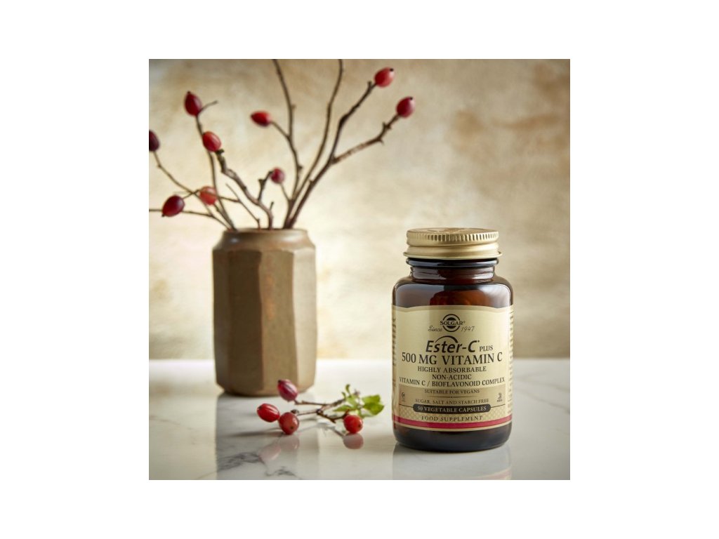 Solgar Ester-C Plus 500 mg – šetrný vitamín C s vysokou vstřebatelností. Posiluje imunitu, tvorbu kolagenu, energii a obranyschopnost. Obohaceno o bioflavonoidy, šípky, acerolu a rutin. 250 rostlinných kapslí.