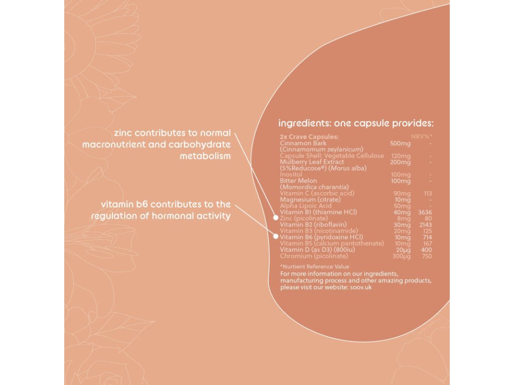 Crave je 7denní doplněk stravy bez cukru a stimulantů, navržený pro ženy, které během menstruace bojují s chutěmi na sladké. Obsahuje skořicovou kůru, moruši, chrom, B6 a další látky na podporu hormonální rovnováhy a metabolismu cukrů.