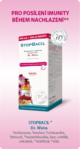 Doplněk stravy: STOPBACIL obsahuje jedinečnou kombinaci 10 rostlinných extraktů ALPINIUMTM, mj. echinaceu, ženšen, schizandru a jitrocel, které několika navzájem se podporujícími mechanismy posilují imunitu, pomáhají při kašli, škrábání v krku a zahlenění a povzbuzují organismus při únavě a vyčerpání.