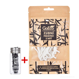 GoEco® sada pro dentální hygienu – 30 m zubní nit z bambusového vlákna + 30 ks párátek z kukuřice s dentální nití. Ekologické, kompostovatelné, prakti...
