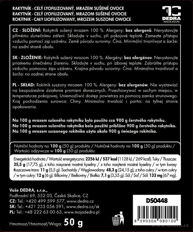 Složení: rakytník sušený mrazem 100 %. Bez alergenů. Nevystavuj přímému slunečnímu záření. Skladuj v suchu, při pokojové teplotě. Zamez přístupu vzduchu pomocí zip uzávěru.