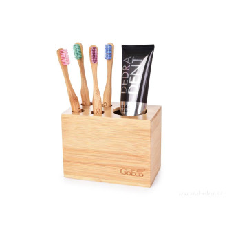 Ekologický bambusový stojan GoEco® na zubní kartáčky a pastu – minimalistický design, 4 otvory pro kartáčky a 1 pro pastu. Stylový a hygienický doplně...
