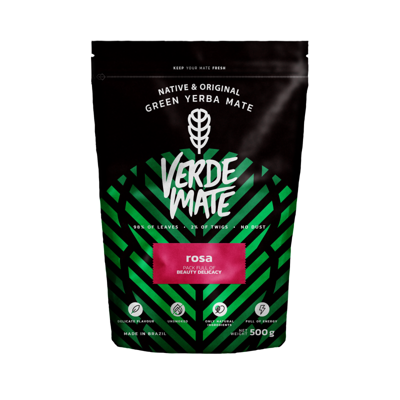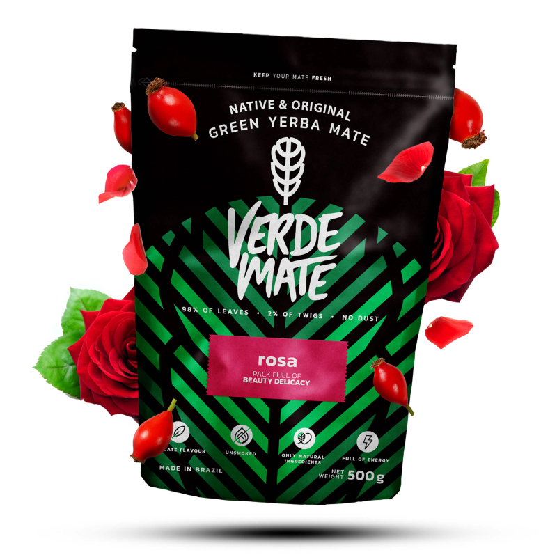 Verde Mate Green Rosa 0,5 kg. Jemné yerba maté s okvětními lístky růží 500 g. Jemná chuť. Přírodní kofein. Čaj Yerba Mate z Brazílie 500 g.