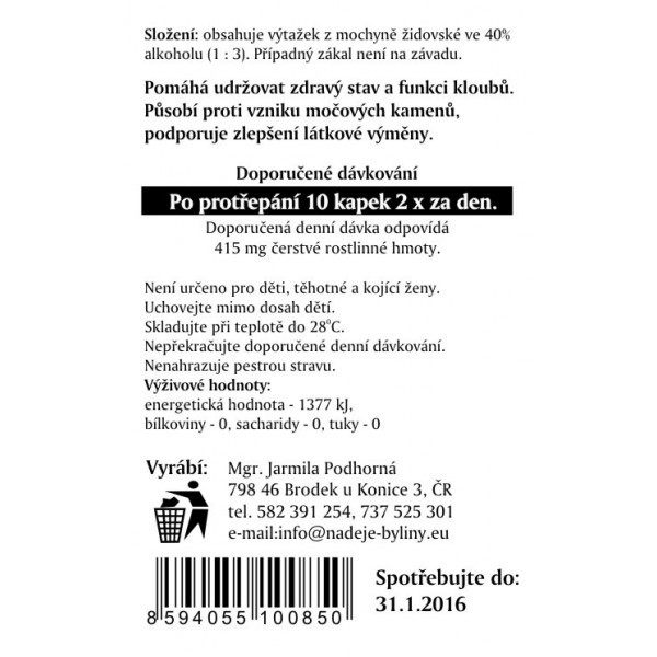 Odborná literatura uvádí: židovská třešeň pomáhá udržovat zdravý stav a funkci kloubů, působí proti vzniku močových kamenů, stimuluje a harmonizuje látkovou výměnu. Datum minimální spotřeby 8.1.2023